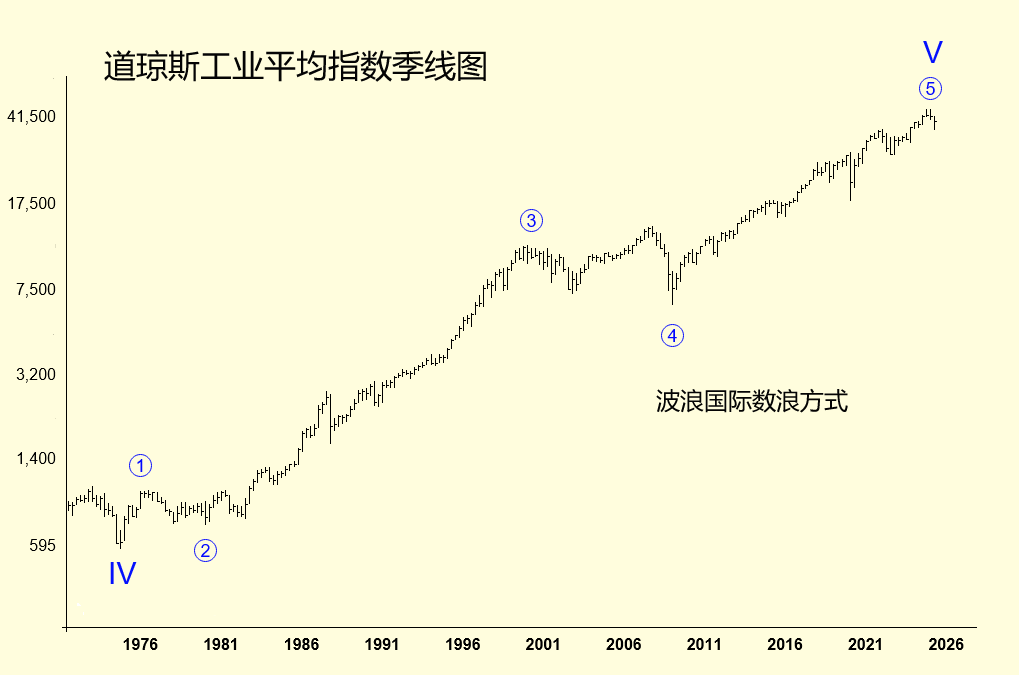 1929年高点笔者定义为循环浪I,自1929年高位跌至1932年低点为循环浪II,循环浪III由此展开。去年年底,笔者在《二零二五年金融市场展望》一文中,对标普500指数如此作波浪划分:循环浪III由1932年低点一直升至2000年高点,其中1932年低点升至1937年高点为III浪[1],1937年高点跌至1942年低点为III浪[2],1942年低点升至1966年高点为III浪[3],其后以水平三角形完成III浪[4],终点是1974年底低点。III浪[5]则由1974年低点升至2000年高点,如此完成循环浪III。循环浪IV由2000年高点震荡跌至2009年3月低点,2009年3月展开循环浪V上升。如此划分方式,浪II急跌,与浪IV反复震荡相对照,符合交替原则。