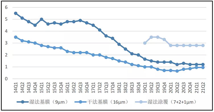 回顾过往,隔膜价格自2014年一路下跌,下跌原因是供给端行业储备过量,需求端疲软,总供给大于总需求,但在2019年之后,随着新能源汽车行业发展,隔膜需求增加,价格下跌趋势终止,处于低位徘徊。第三方研究机构认为,如果2021第四季度国内新能源汽车市场能够得以保持快速增长势头,预计隔膜价格增长将超10%。