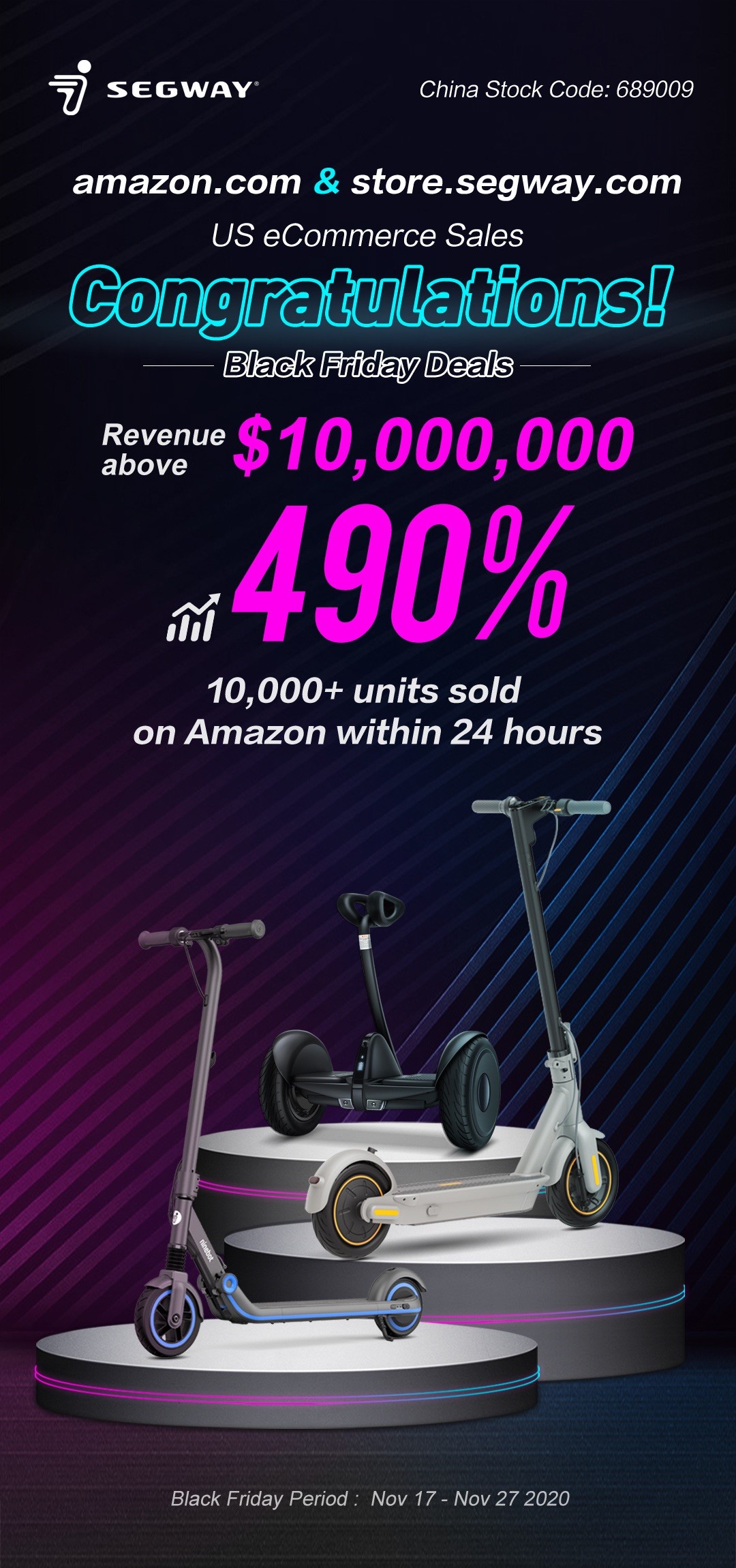 随着国际影响力的提升,九号公司不仅在国内市场表现优秀,在海外市场业绩也一路飘红:在其上市后的第一个国内大促“双十一”期间,九号公司全渠道销售额突破1.3亿元,同比去年双十一增长超过77%;在海外市场,今年“黑色星期五”期间,九号公司凭借对当地市场的深耕以及对产品的细致打磨,取得了斐然战绩,11月12日-27日仅电商平台销售额就超过1000万美金,同比增长490%!黑五当天24小时内,其在美国亚马逊平台售出超过10000台电动滑板车、电动平衡车产品。