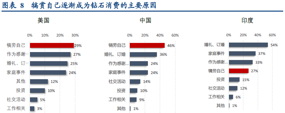 很多男性可能会觉得,钻石通常被用作婚庆的示爱产品,价格越高才能显示出珍贵,培育钻石看起来像是假冒伪劣产品,毫无价值可言。其实不然,首先培育钻石属于真钻,与天然钻石同处一类,不是仿钻。其次钻石消费并非只用于婚庆市场,女性购买钻石多数时候是自我奖励,满足日常配饰需求。据戴比尔斯调查显示,无论是在中国还是在发达国家美国,悦己需求在钻石消费意愿中占比都是第一,有60%-70%的女性购买钻石是为了悦己需求,用于非婚庆场景。因此,培育钻石的高性价比有其替代的细分市场。