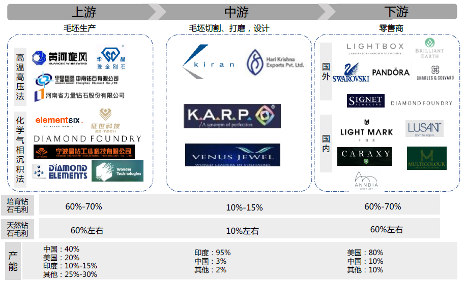 从产业链来看,主要由上游毛坯生产商、中游切割打磨商和下游品牌商三部分构成,从盈利数据上看,整个产业链的毛利率呈现出微笑曲线的走势,上游和下游汲取了产业链最大的利润,其中上游的毛利率在60%以上,净利率约为50%(天然钻石这两项数据分别是60%和20%),下游是60%-70%的毛利率。