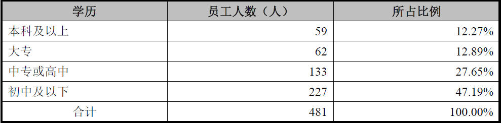 从员工学历结构来看,2018年末在这481名员工中,大专及大专以下学历的员工总数为422人,占员工总数的87.73%;本科及以上的员工人数仅59名,占总数的12.27%。显然,锐新昌的员工学历水平偏低,本科及以上员工寥寥,将近一半的员工为初中及以下学历,这样低学历水平的员工自然无法胜任高科技岗位,显示公司业务的技术含量总体低下。(见表二)