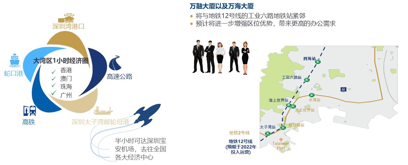 同时,随着大湾区1小时经济圈的建设,蛇口网谷运输网络完善、高效,可实现与全国各大经济中心、大湾区核心城市及深圳产业枢纽及商业中心紧密相连。万融大厦以及万海大厦将与地铁12号线的工业六路地铁站紧邻,预计将进一步增强区位优势,带来更高的空间使用需求。