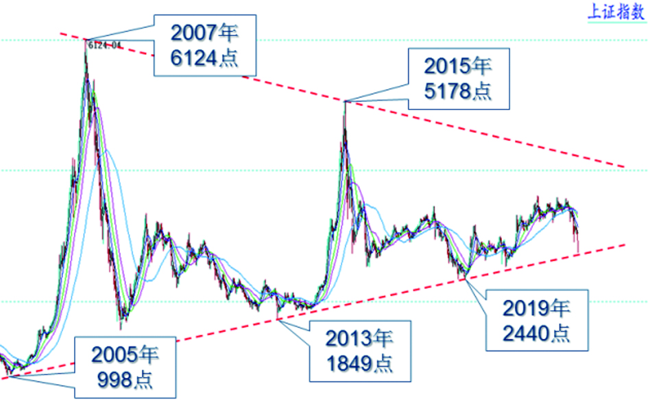 如图所示,笔者在2017年出版的《浪的解析》书中就曾分析,未来若干年,上证指数可能在这个大型收敛三角形内运行。2019年初的情况比较符合,并且2440点正是政策底之后的市场低点。2020年3月的2646点,很靠近低点连线,之后反转向上。4月27日早盘,上证指数最低2863点,同样非常贴近了。