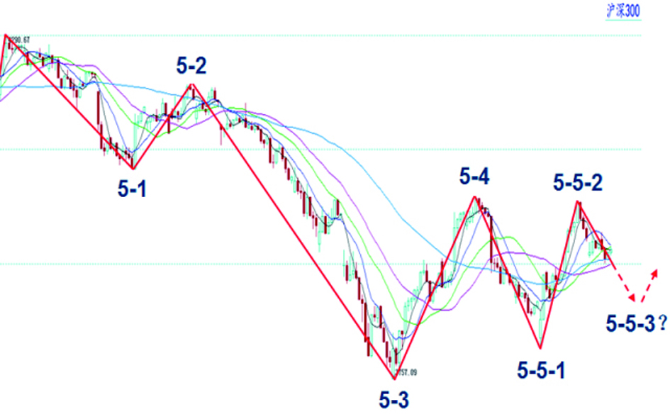 从浪形上观察,沪深300指数在5月5日高点后进入了5-5浪段。(见图一)