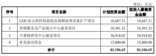 从卡莱特的募资计划来看,本次计划募集资金共计8.3亿,其中预计运用于研发中心建设项目的资金量最多,大约占到总额的一半,而计划投向扩产项目的资金是最少的。