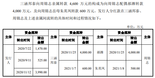 值得注意的是,2020年卡莱特向实控人周锦志支付的分红款是通过其持股平台三涵邦泰向其亲属转款后,再由亲属转给实控人本人。从资金流转信息可以看出,该款项分开3笔支付,滞留在三涵邦泰的时间跨度从2020年7月到2021年1月,最长达到近半年,似乎存在不当占用公司资金的嫌疑。