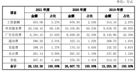 对广告营销的重视也体现在老乡鸡的财务费用上。报告期内,广告宣传费在公司销售费用中的占比仅次于外卖服务费,分别为42.30%、32.54%、21.92%。