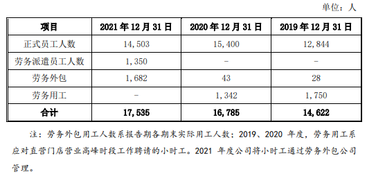 事实上,居高不下的员工流失率也的确是老乡鸡迫切需要解决的问题。根据招股书披露,2019年到2021年老乡鸡的员工流失率分别为42.5%、47.47%、47.87%,呈现持续增长的态势。截至2021年末,老乡鸡正式员工数为14503人,而上年同期为15400人,减少了897人。与此同时,非正式员工的总数从上年的1385人增加到了3032人,翻了一倍不止,显然是出于节约用人成本的目的,选择以大量劳动派遣及外包的形式取代正式员工。