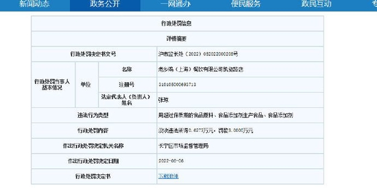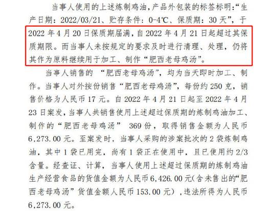据上海市市场监督局网站消息,6月6日,老乡鸡(上海)餐饮有限公司凯旋路店因使用过期炼制鸡油加工、制作食品,并对外销售,被长宁区市场监督管理局罚款8万元、没收违法所得6273元。处罚详情显示,当事人3月从其公司的中央厨房购入2袋餐饮半成品炼制鸡油(保质期至4月20日),用于加工、制作“肥西老母鸡汤”并销售。4月21日至4月23日案发,当事人共销售使用上述过期炼制鸡油加工、制作的“肥西老母鸡汤”369份,取得销售额6273元。