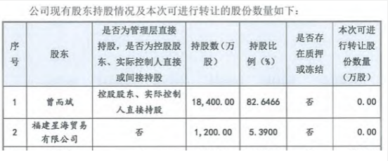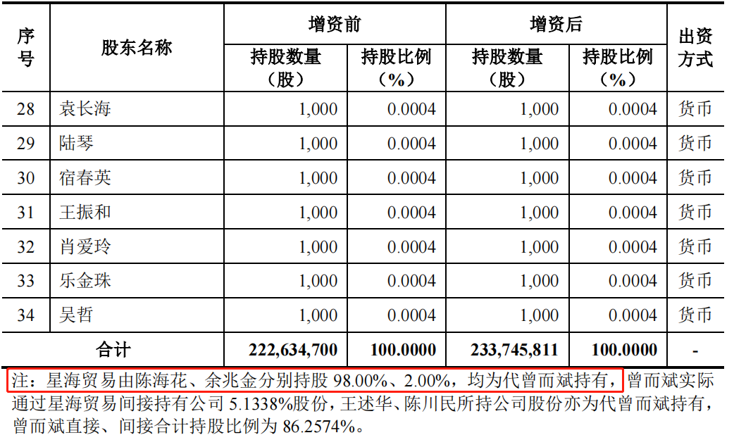 但此次主板IPO申报稿关于2015年1月的股权转让说明显示,“星海贸易由陈海花、余兆金分别持股98.00%、2.00%,均为代曾而斌持有”。直到2018年1月终止新三板挂牌时,该代持还是存在。另外,星海贸易的股东2019年才由陈海花和余兆金变为曾而斌。