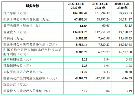 业绩情况方面,招股书显示,飞沃科技2020年至2022年营业分别约为11.96亿元、11.30亿元和13.40亿元,净利润分别约为1.60亿元、7862.98万元和9385.85万元,扣非后净利润分别为1.66亿元、6329.77万元和8383.78万元。