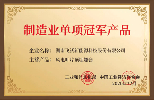 在风电领域,飞沃科技经过近十年的发展,已成长为全球风电高强度紧固行业最重要的供应商之一。根据中国机械通用零部件工业协会出具的证明,飞沃科技生产的风电叶片预埋螺套2019年在所属单品细分市场的国内占有率达81.6%、全球占有率达70.8%,排名第一,并于2020年被工业和信息化部、中国工业经济联合会评选为第五批制造业单项冠军产品。